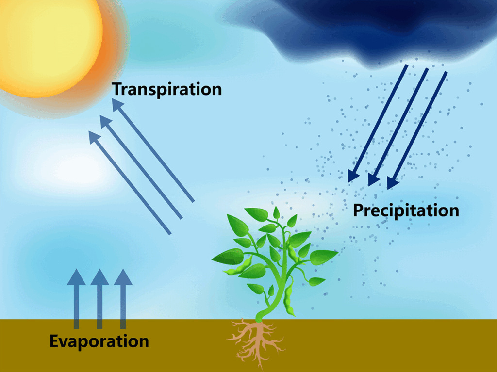 Evapotranspiration (ET) is the combination of two separate processes – evaporation and transpiration – working simultaneously to facilitate a plant’s growth and productivity by regulating its temperature and aiding in nutrient uptake. Evaporation refers to the movement of water to the air from sources such as the soil, plant canopy, and waterbodies. Transpiration refers to the process of water movement through a plant and its evaporation from stomata in leaves, stems, and flowers.